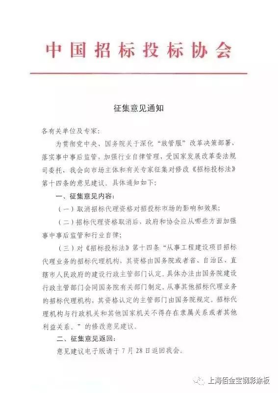 7月31日,受國家發改委法規司委托,中國招標投標協會將組織市場主體、業內專家學者,就《招標投標法》第十四條關于工程招標代理機構資質管理的條款修訂收集意見。