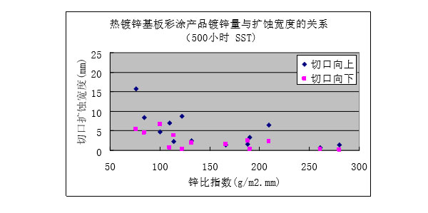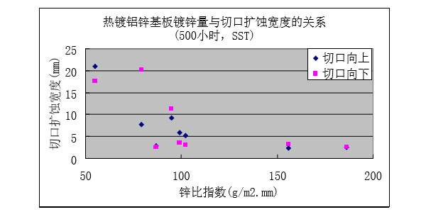 ?保留切口樣板的鹽霧試驗(yàn)(1500小時(shí))后,隨著鍍鋁鋅層重量增加,紅銹出現(xiàn)的比例降低。