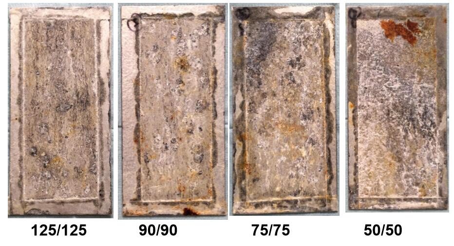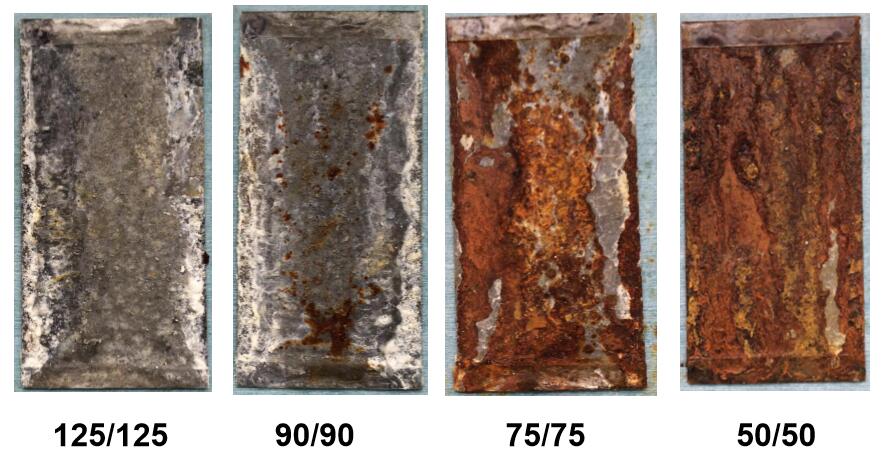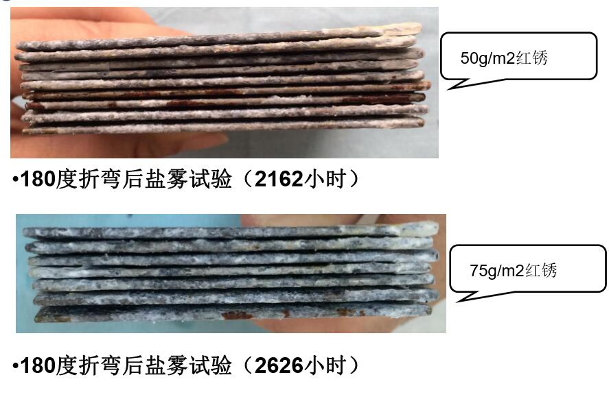 ?封邊鹽霧試驗(yàn)(2162小時(shí))后,相比50/50g/m2的鍍層產(chǎn)品,厚鍍層產(chǎn)品紅銹面積仍然很低