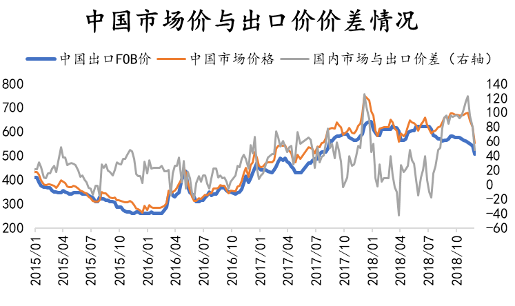 首先在11月下旬中國FOB價格出現(xiàn)大幅的下跌,鋼廠接受海外訂單量增加,并且11月中旬重點鋼企粗鋼日均產(chǎn)量195.15萬噸。11月中旬重點鋼企粗鋼日均產(chǎn)量195.15萬噸,旬環(huán)比增加3.51萬噸,增長1.83%。截至11月中旬末,重點鋼鐵企業(yè)鋼材庫存量為1327.11萬噸,旬環(huán)比增加104.23萬噸,上升8.52%。從鋼企日均產(chǎn)量可以看出,目前鋼材產(chǎn)量還是在不斷上升中,決定目前鋼市價格的還是下游的終端需求,但目前市場供大于求的狀況未有改變,并且國內(nèi)貿(mào)易商冬儲意向并不明顯,且部分地區(qū)出現(xiàn)停工現(xiàn)象,導(dǎo)致鋼廠出口意愿增加。另外中美貿(mào)易戰(zhàn)進入90天“停火期”,這也利好鋼材的出口增加。綜合來看,12月份出口量或接近600萬噸,同環(huán)比均會有所上漲。
